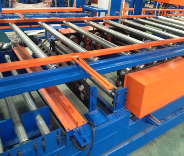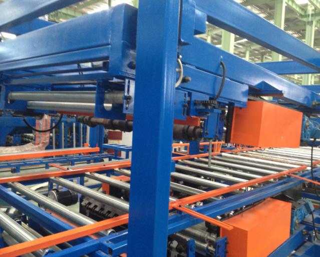主要由瓦楞板壓型機(jī)和彩鋼復(fù)合機(jī)組成,可以一次性制做墻面彩鋼夾芯板或屋面彩鋼夾芯板,并且瓦楞板壓型機(jī)和復(fù)合機(jī)可以獨(dú)立生產(chǎn)。整條流水線壓型部分由彩鋼板開卷機(jī)、冷彎成型主機(jī)、切斷裝置組成,復(fù)合機(jī)部分由彩鋼板開卷,EPS板或巖棉板輸送,墻面淺波峰壓制,混合涂膠、加溫加壓、復(fù)合、平板卷邊、企口板翻邊、開槽、整邊、氣動(dòng)夾緊、自動(dòng)覆膜、自動(dòng)切割、成品拖架組成;